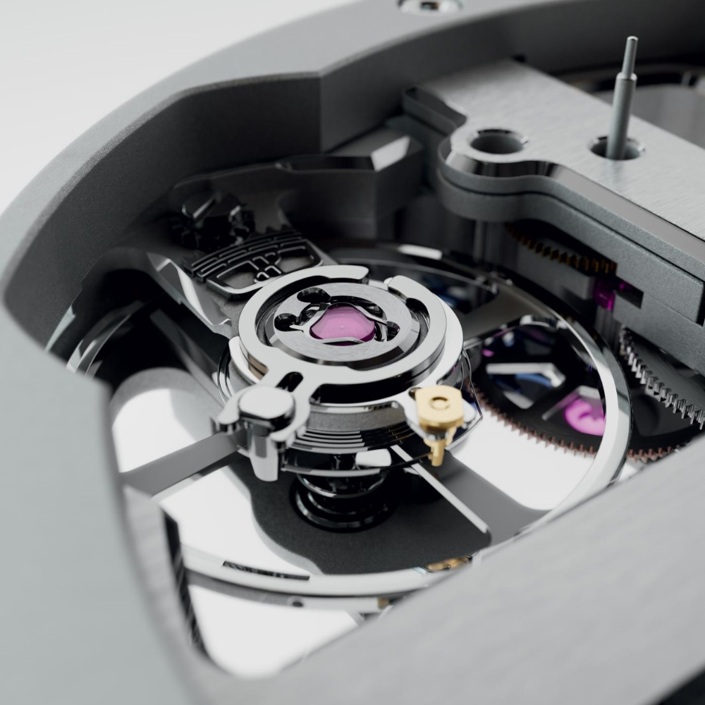This model showcases a commanding technical aesthetic. The high-quality black rubber strap offers comfort and contrasts beautifully with the case. The fixed round bezel, finished in a technical style with signature exposed screws, frames the intricate skeleton dial. The open-worked face reveals the movement within, complemented by skeleton baton hands and hour markers with luminous coating, creating a depth that is both mesmerizing and easy to read.