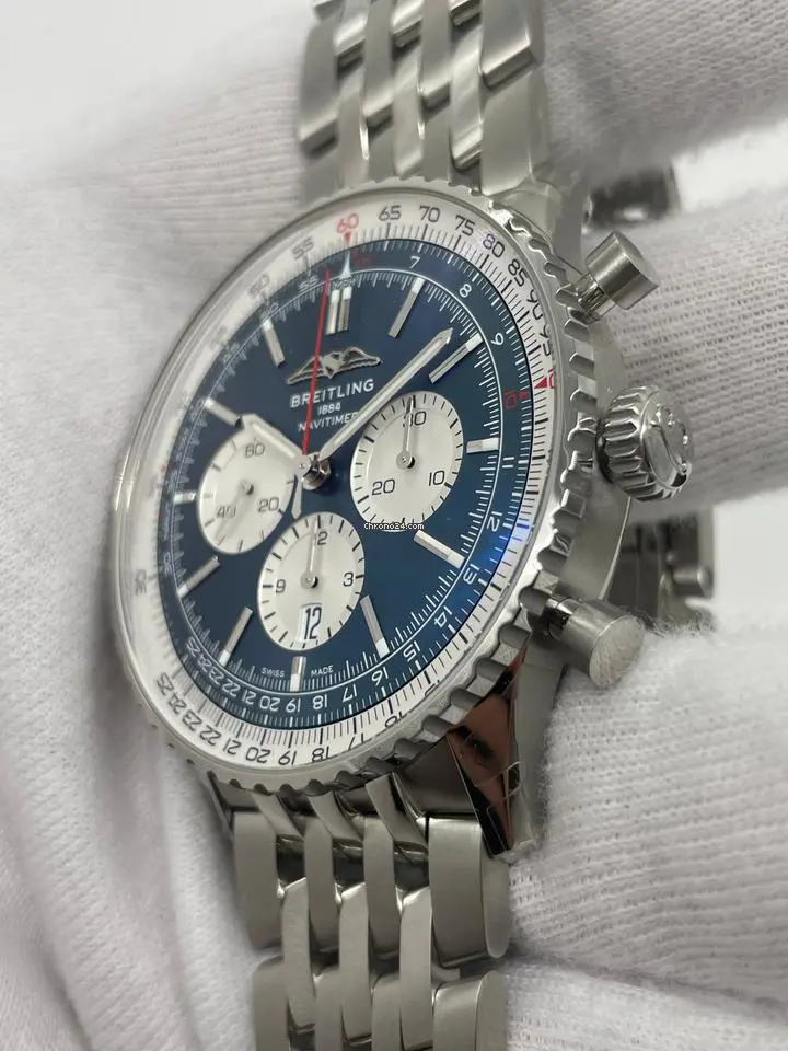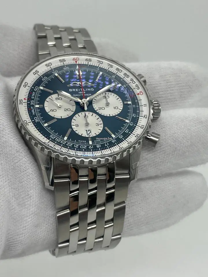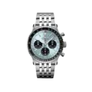 The Breitling Navitimer B01 Chronograph 41 Ref. AB0139241C2A1 features a sporty yet elegant aviation style, highlighted by a unique light blue dial. It combines a 904L stainless steel case and bracelet with a classic chronograph layout featuring three contrasting black sub-dials. The signature bidirectional slide rule bezel adds a strong technical feel, making it suitable for men who love mechanical watches, engineering passion, and a dynamic lifestyle.