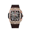 The Hublot Spirit of Big Bang King Gold 45mm, Ref# 601.OX.0183.LR embodies a super-luxury sporty style full of power with its signature tonneau design. It features a robust 904L stainless steel case in a rose gold tone, adorned with high-quality synthetic stones on the bezel and case body, combined with a high-quality brown leather strap. The skeleton chronograph dial with rose gold hands and sporty red accents creates an aggressive yet refined look, perfect for those who love high-end sports watches with a distinct and outstanding design.
