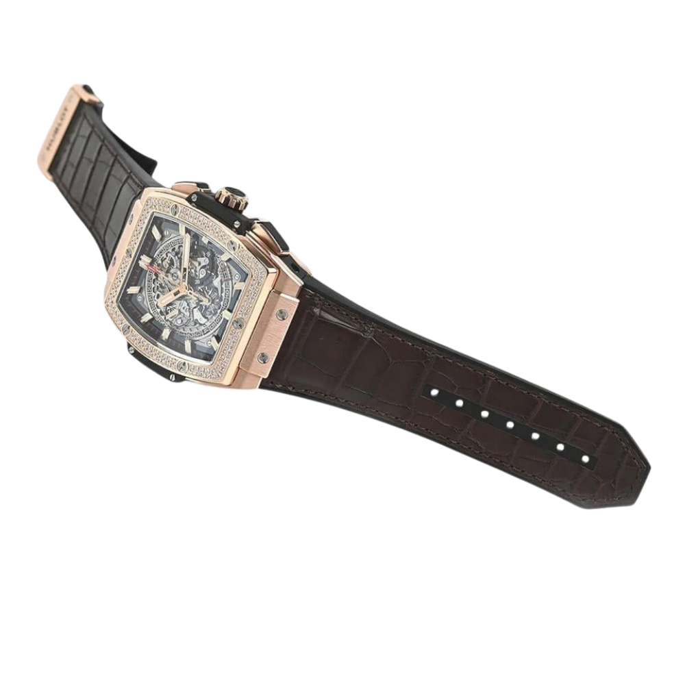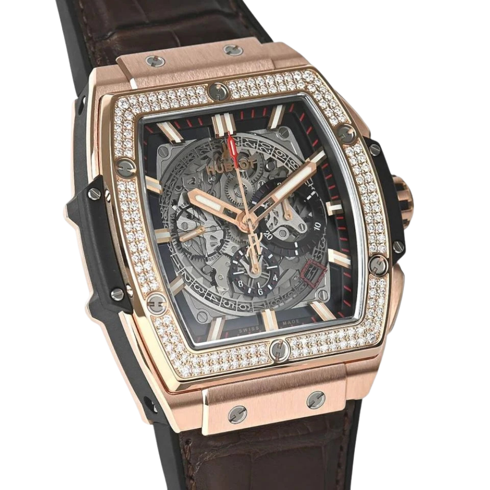 The Hublot Spirit of Big Bang King Gold 45mm, Ref# 601.OX.0183.LR embodies a super-luxury sporty style full of power with its signature tonneau design. It features a robust 904L stainless steel case in a rose gold tone, adorned with high-quality synthetic stones on the bezel and case body, combined with a high-quality brown leather strap. The skeleton chronograph dial with rose gold hands and sporty red accents creates an aggressive yet refined look, perfect for those who love high-end sports watches with a distinct and outstanding design.