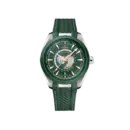 The Omega Seamaster Aqua-Terra Worldtimer 43 embodies a high-end sports style infused with a modern travel-oriented spirit. The deep green color palette paired with a central skeleton detail and gold-toned luminous hands and markers creates a powerful yet sophisticated presence. The embossed rubber strap ensures comfort and versatility, making the watch suitable for daily wear as well as long-distance journeys, reflecting the image of a confident, dynamic man with a passion for mechanical innovation.