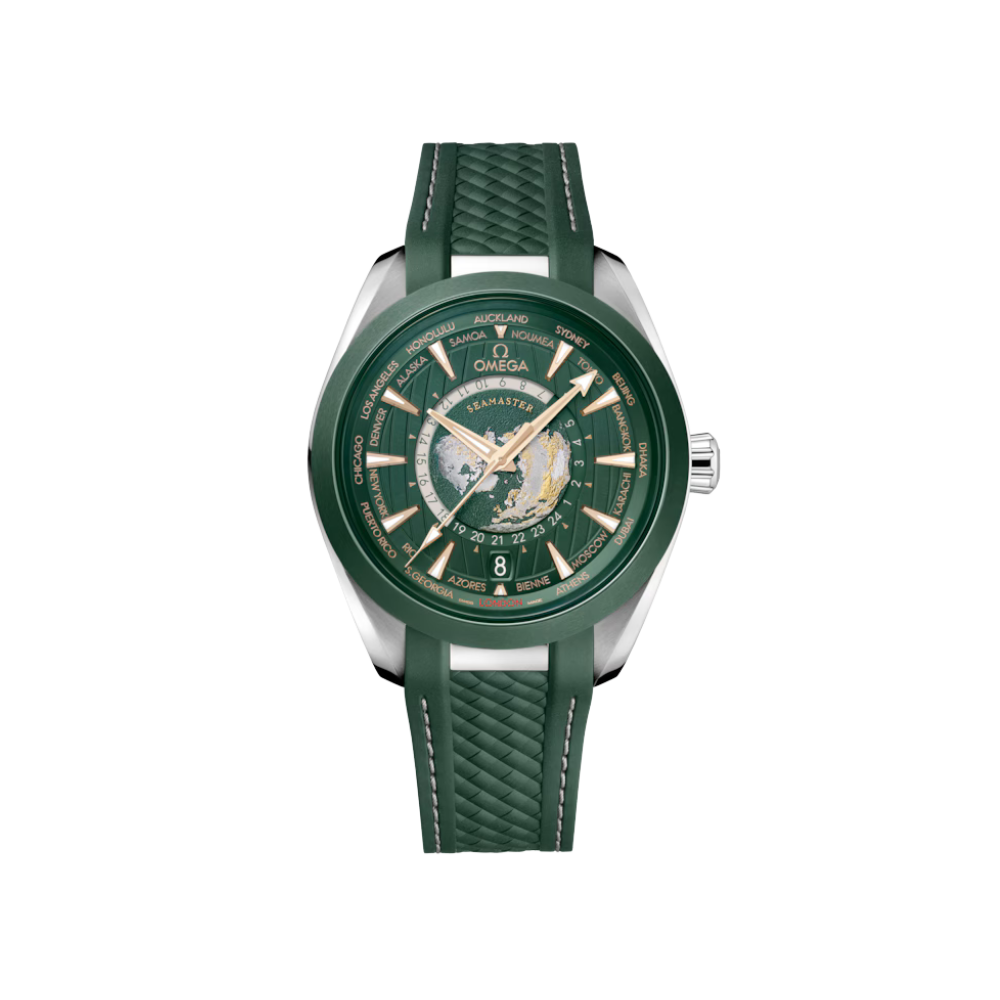 The Omega Seamaster Aqua-Terra Worldtimer 43 embodies a high-end sports style infused with a modern travel-oriented spirit. The deep green color palette paired with a central skeleton detail and gold-toned luminous hands and markers creates a powerful yet sophisticated presence. The embossed rubber strap ensures comfort and versatility, making the watch suitable for daily wear as well as long-distance journeys, reflecting the image of a confident, dynamic man with a passion for mechanical innovation.