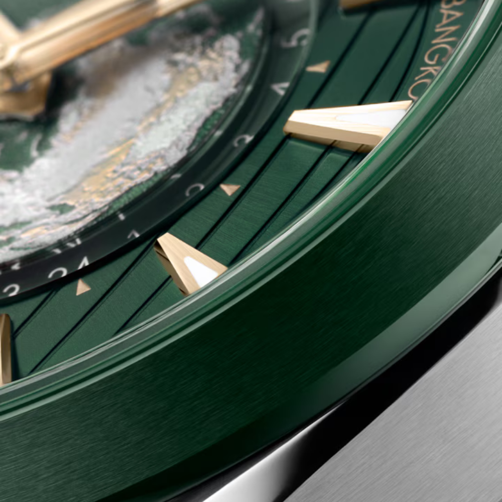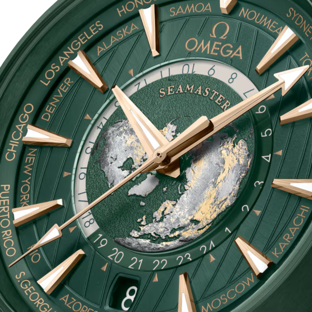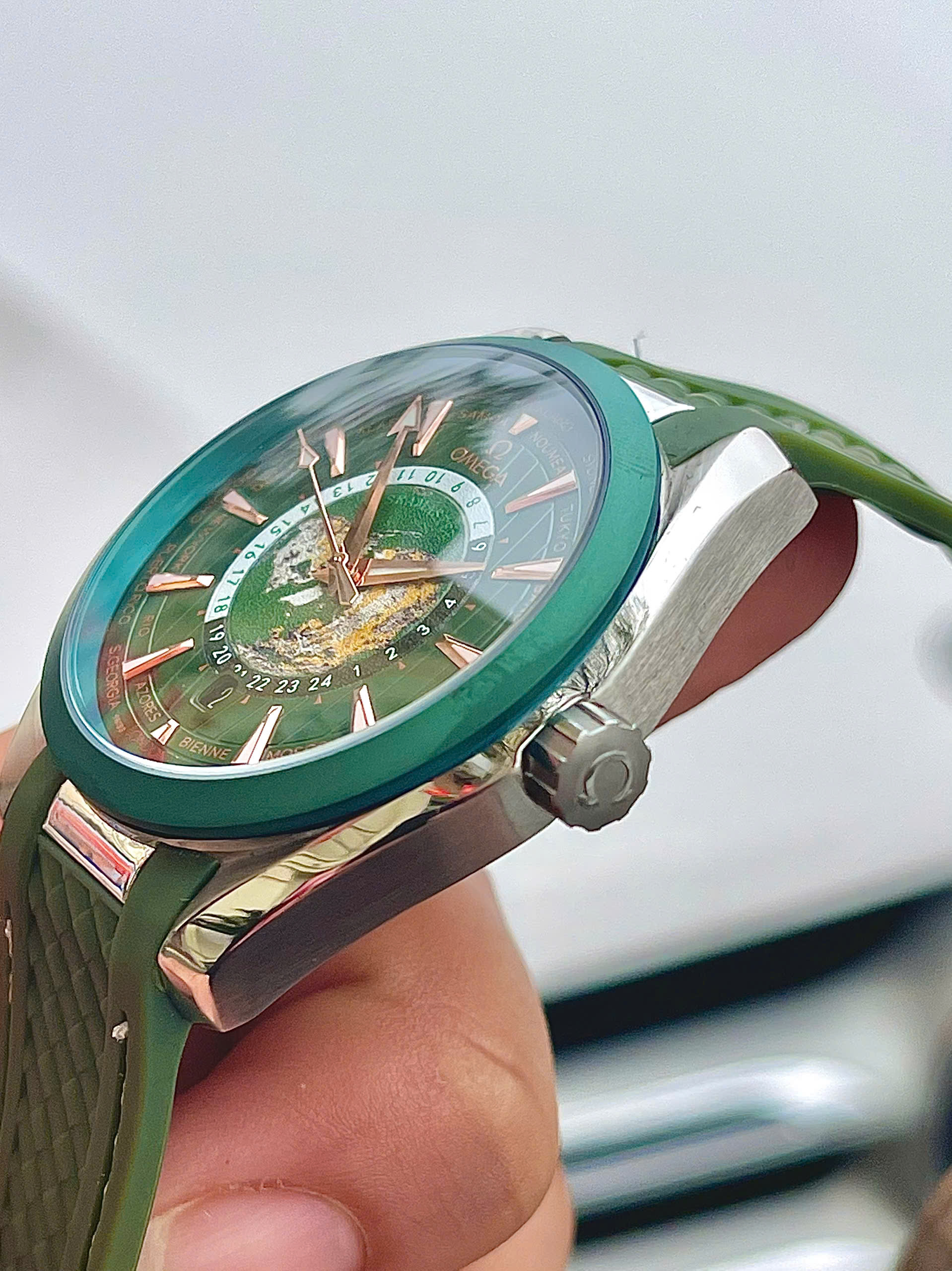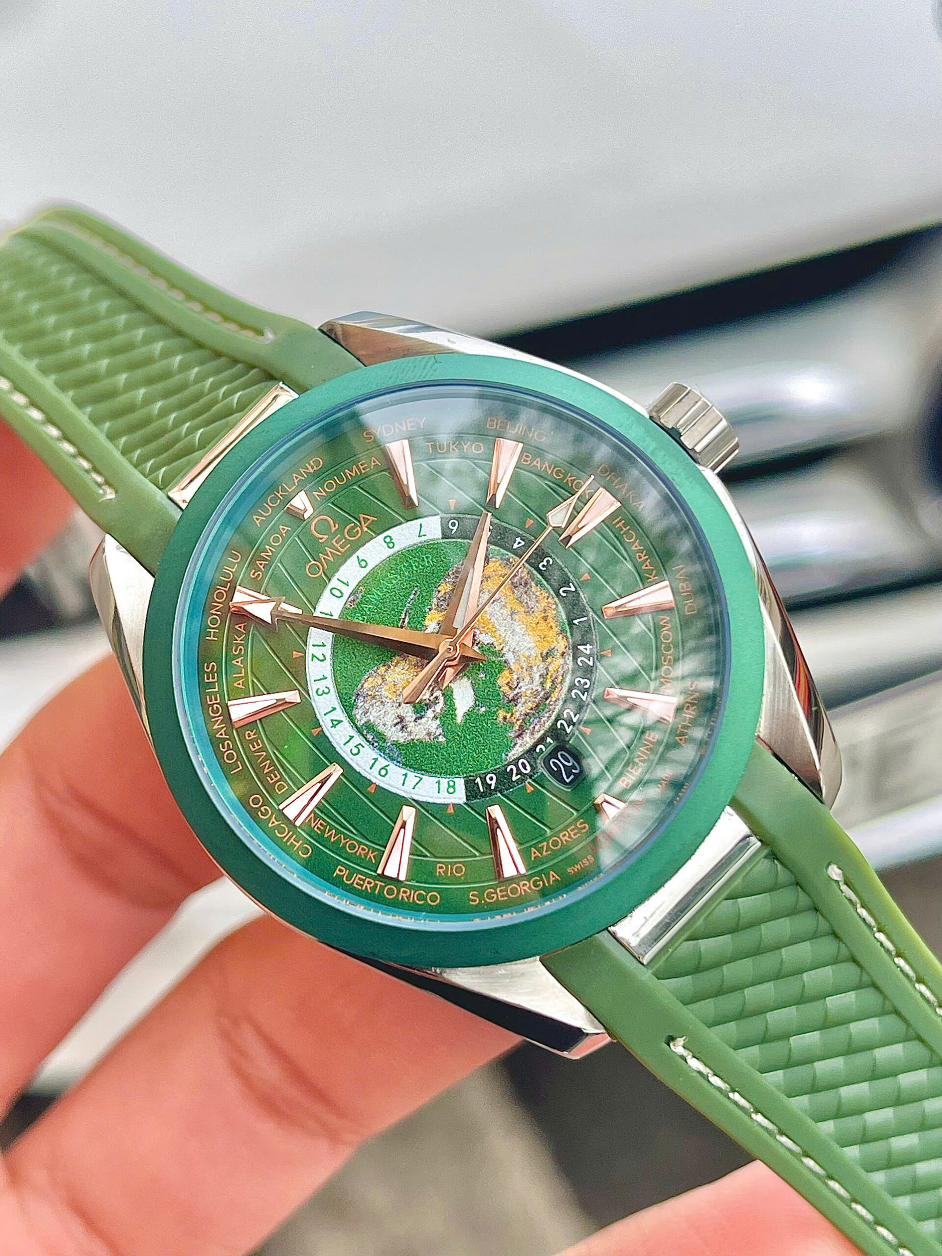 Inspired by the Seamaster legacy that began in 1948 and the enduring spirit of ocean exploration and global discovery, the Aqua-Terra Worldtimer 43 reflects the ambition to connect the world through time. The green dial with a central open-worked design evokes a miniature map of time itself, symbolizing journeys across continents and time zones. Supported by modern materials and a stable Japanese Miyota movement, this watch goes beyond simple timekeeping to represent freedom, precision, and the continuation of Omega’s historic values within a bold, contemporary design.