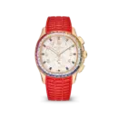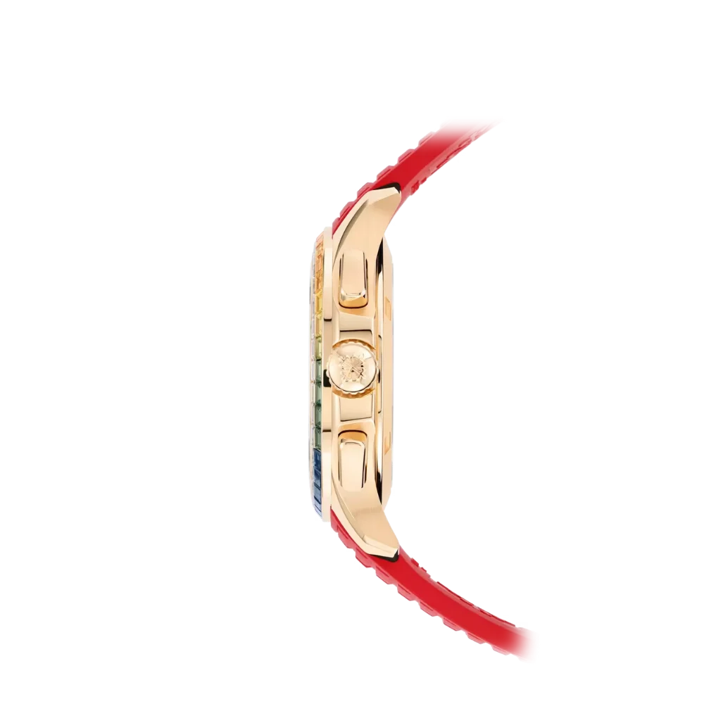 This model exhibits a distinct and energetic aesthetic. The high-quality red rubber strap offers a bold and sporty look. The round bezel is meticulously set with multi-colored artificial stones, creating a rainbow effect that contrasts with the 904L stainless steel case. The white dial features the signature pattern, while hands and markers with luminous coating ensure visibility, emphasizing a personality that is both unique and functional.