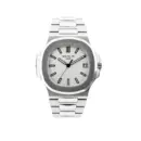 The Patek Philippe Mens Watch 5711-1A-011 captures the elegant sporty spirit characteristic of the Nautilus line, featuring a soft rounded case shape. It stands out with a solid 904L stainless steel integrated bracelet and a refined silver dial with horizontal grooves that create visual depth. This design offers a look that is both luxurious and modern, suitable for wearing daily or on formal occasions.
