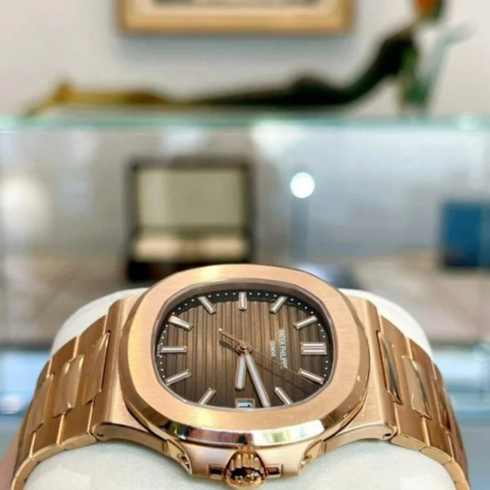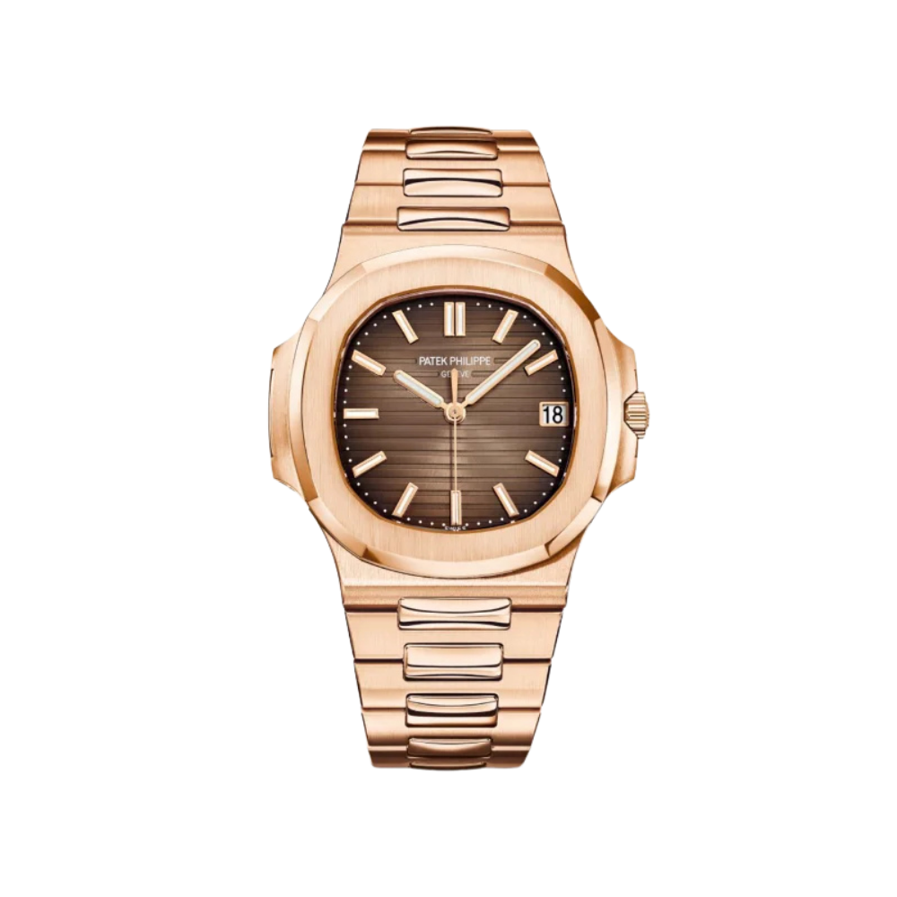 The Patek Philippe Nautilus Rose Gold 5711-1R-001 features the signature sporty luxury style of the Nautilus line, defined by a 904L stainless steel case and bracelet finished in a brilliant rose gold tone. It stands out with a seamless integrated design and a unique light/dark brown gradated dial with horizontal brushing that creates impressive visual depth. This model exudes a look that is powerful, refined, and discreetly classy, suitable for gentlemen who appreciate sustainable values and a luxurious style.
