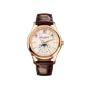 The Patek Philippe Ref. 5205R-001 embodies a classic elegant style true to the spirit of a dress watch, featuring a refined rose gold-tone finish on a robust 904L stainless steel case. It stands out with a balanced ivory white dial incorporating calendar and moonphase displays, combined with a high-quality brown leather strap. This model offers a look that is warm, discreet yet deep, perfectly suitable for gentlemen who love sophistication and timeless standards.