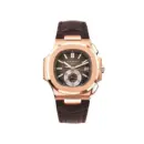 The Patek Philippe Watches Nautilus Mens 5980R-001 showcases a luxurious sporty style with a distinctive rounded bezel design. It features a strong black dial with horizontal grooves, combined with a classic brown textured leather strap, creating an elegant yet masculine appearance. This model is suitable for modern businessmen who love high-end sports watches that are flexible enough to transition from daily work to formal occasions.