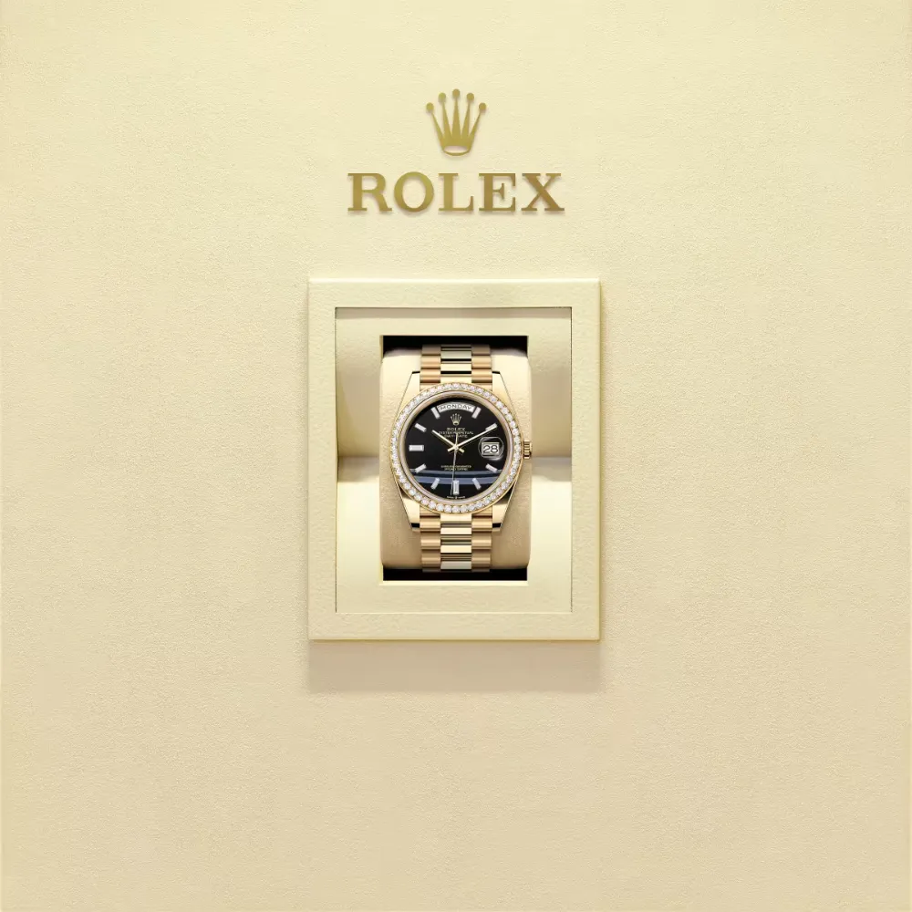 Paired with a diamond-set bezel and the President bracelet, the Day-Date 40