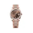 This model exhibits the distinctive Day-Date elegance, featuring a President bracelet made from 904L steel, renowned for its durability and style. The Fluted bezel enhances the luxury feel, with synthetic stones set along its edge, creating a striking contrast against the rich chocolate dial. Ideal for those who prefer classic refinement with a modern twist, this watch makes a bold yet sophisticated statement.