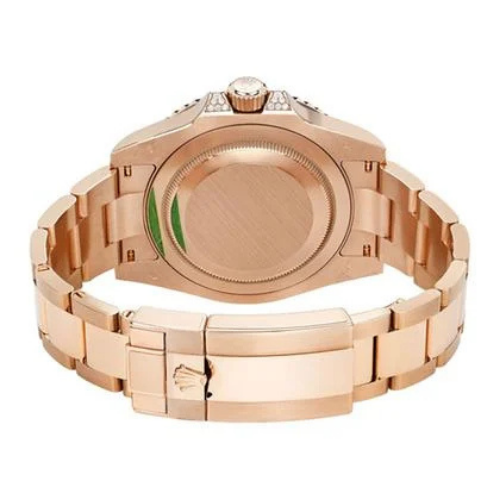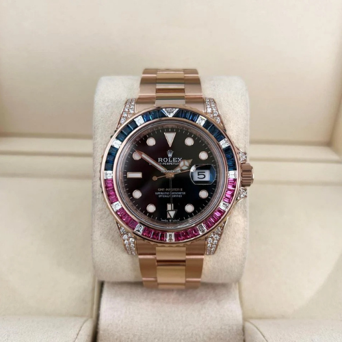 The Rolex GMT-Master II Sapphires Swiss 126755SARU embodies a peak luxury sporty style, featuring an Oyster case and bracelet made of 904L stainless steel finished in a warm Everose gold tone. It stands out with a powerful black dial combined with a bidirectional rotating bezel set with two-tone red and blue artificial stones, creating a striking and unique highlight. The overall design balances subtle power and suitability for frequent travelers who still demand a classy and distinct image.