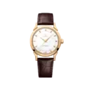 This model showcases a refined and vintage aesthetic. The high-quality brown leather strap features a classic alligator surface texture, hugging the wrist comfortably. The fixed bezel is smooth with a rose gold tone and a polished finish, framing the face elegantly. The white dial follows a minimalist layout with classic vibes, while baton hands and hour markers in rose gold tone ensure easy readability and enhance the overall warm and prestigious look.