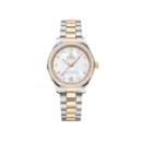 This model showcases a refined and dazzling aesthetic. The strap is a 904L stainless steel bracelet with a demi rose gold finish and a 3-link structure, embracing the wrist with a luxurious feel. The round bezel is meticulously set with high-quality artificial stones and finished with a polish. The white mother-of-pearl dial adds depth, while round hands and stone-set hour markers with light luminous coating ensure readability and enhance the gentle, prestigious beauty.